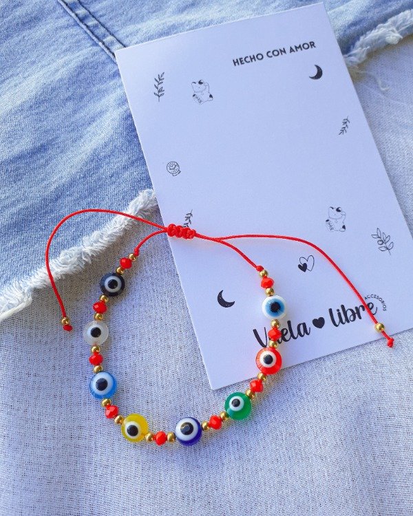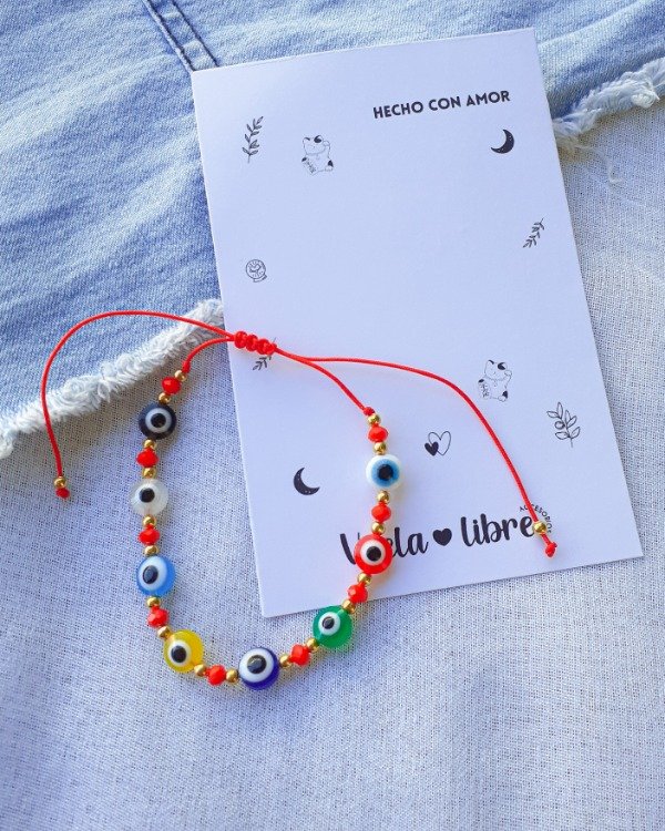 Materias: hilo chino, pulsera regulable. ojitos de colores y bolitas de cristales + fundición dorada.